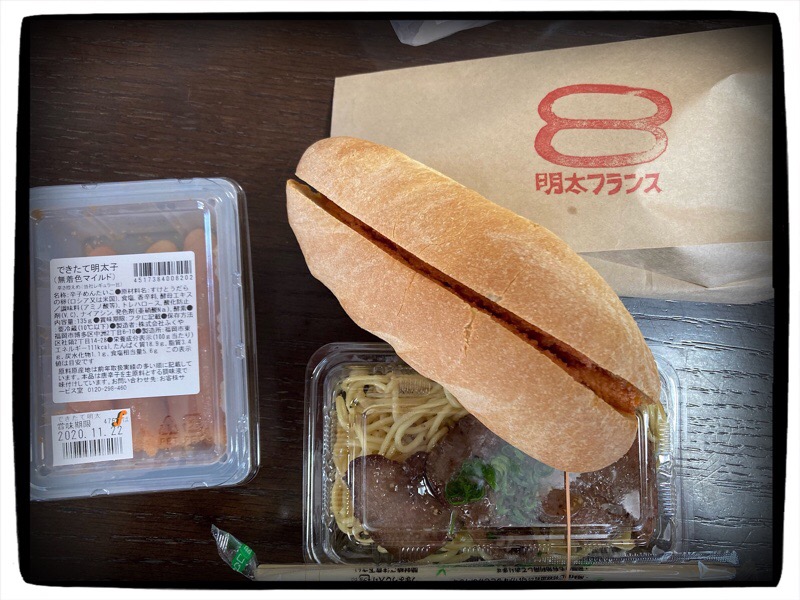 買ったのは明太フランス、できたて明太子、牛タン塩焼そば。