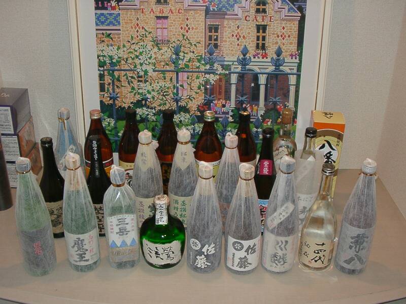 オイラのストックの小瓶のみです。これは以前の写真で、これに、千代吉、壱の醸朝日、かんろ、手づくり八重桜、赤霧島があります。一升瓶は、画像に納まりそうもありません。ほんと購入を控えたいと思ってます。でもいい焼酎を見ると買ってしまうので、なるべく酒屋の前を通らないようにしてます。