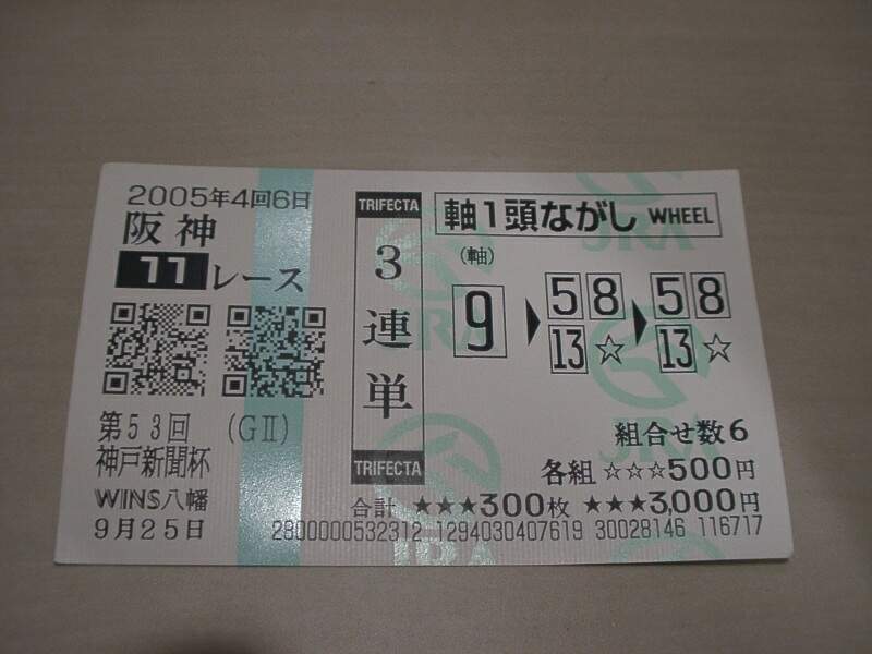 | 今日の阪神競馬のメインレース神戸新聞杯、見事に三連単で馬券ゲットしました。配当 \3,970 で中々ホクホクです。しかしディープインパクトの強さは半端じゃないっす。ハミをとり、一発のムチであのタイム。驚異的です。久々のスーパーホースですので、このまま順調にいってほしい限りです。 それともう一つの当たり。兼八原酒の単品販売の当選です。当選先はあの田○荘であります。この原酒前から欲しくてたまらなかったひとつで、大変うれしく、今晩飲み過ぎそうな予感が・・・。 来週もGTが開催されますので、この運を生かして行きたいと思ってます。 ![]() |